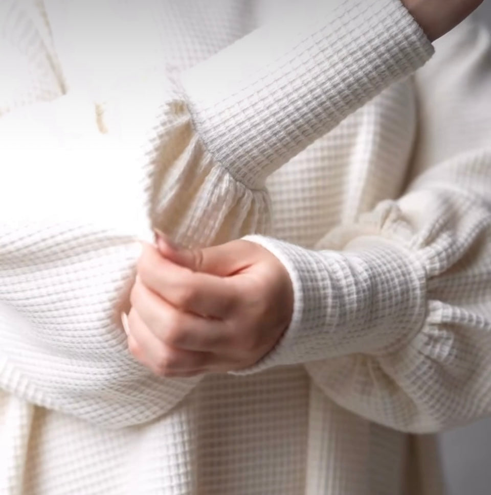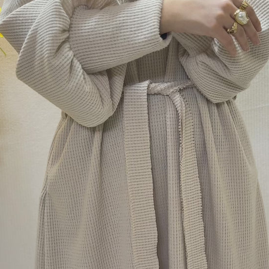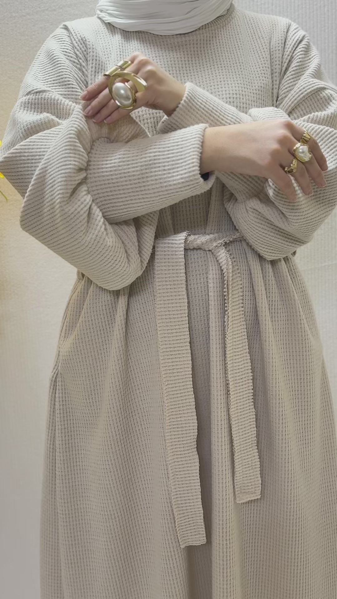 Découvrez cette robe longue conçue en maille gaufrée associée à un tissu tricot ultra-doux, offrant un équilibre parfait entre confort et élégance. Sa coupe fluide épouse délicatement la silhouette, tandis que ses manches légèrement bouffantes ajoutent une touche féminine et moderne.